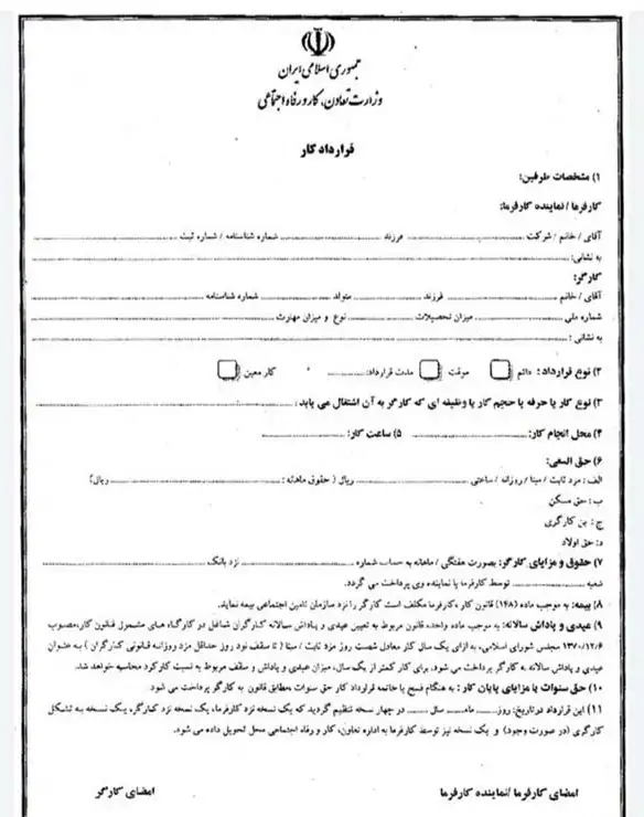 - نوع قرارداد: تعیین میشود که قرارداد دائمی است یا موقت و نوع فعالیت یا وظایف کارگر مشخص میگردد.